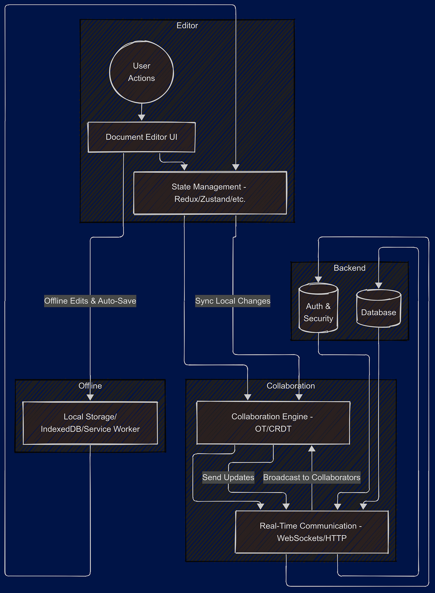 Robustness and Reliability: Users expect their work to be saved automatically and never lost. The design should handle unexpected problems like a user’s browser crashing or a temporary network loss without losing edits. A robust system might store changes locally first, then sync them once the connection is stable.