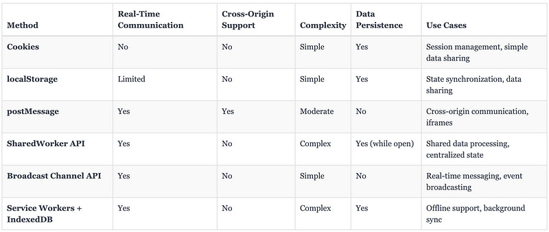 Cross-window communication is essential for web applications where different browser contexts, like tabs, windows, or iframes, need to exchange data. There are several methods available to facilitate this communication, each with unique advantages, use cases, and security implications.